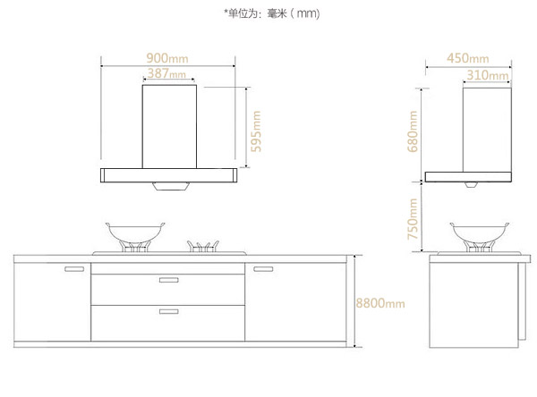 2、為方便煙機安裝,櫥柜需預(yù)留一定空間,在產(chǎn)品尺寸的基礎(chǔ)上,建議多預(yù)留30㎜