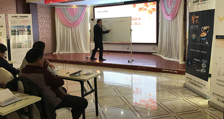 在會議現場,科恩電器育商學院王校長分析了整個廚電行業發展態勢,闡述了江蘇市場的重要性,全面剖析了灌云的市場情況,鼓勵灌云廣大經銷商緊跟公司步伐,聚勢合力共同在促銷,宣傳工作上綜合發力,并指明了未來工作重心和發展方向。并以公司多場終端促銷活動作為引子旁征博引,用豐富的語言深刻形象介紹了產品包裝、品牌傳播、門店建設、渠道建設與整合營銷等多項實戰技能,以幽默風趣的語言,深入淺出的為在場各位經銷商傳授了最深刻的經驗。